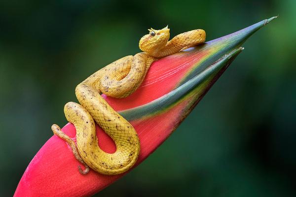 La oropel, una de las serpientes más venenosas del país, destaca de entre la vegetación por sus vivos colores; rasgo que intentamos resaltar en esta imagen.