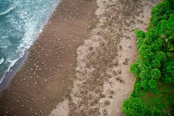 Imagen aérea de una arribada de tortugas lora a Ostional. Debe su nombre a la forma de pico de su mandíbula.