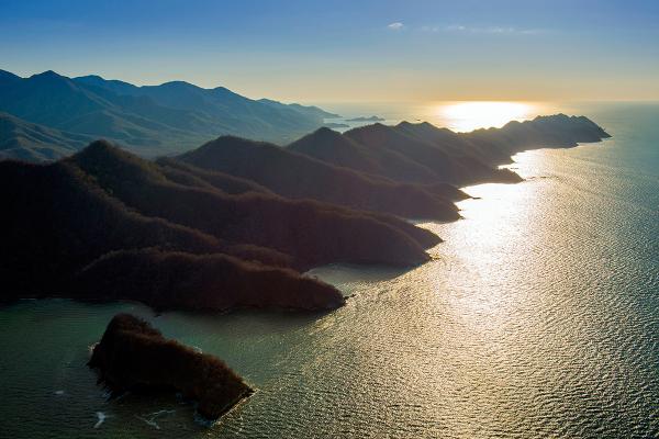Dos filas de colinas corren paralelas hacia el mar. La más cercana al agua recuerda los pies de un monstruo colosal.