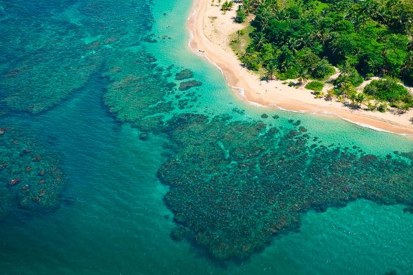 Vista aérea de Manzanillo en que se aprecia, gracias a la claridad de sus aguas, lo escabroso del terreno de arrecife que rodea su costa.