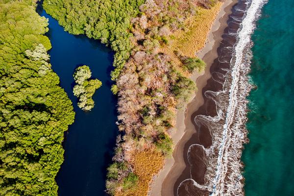 Toma aérea de Potrero Grande que exhibe su variedad cromática, organizada en siete franjas verticales y poco entremezcladas.