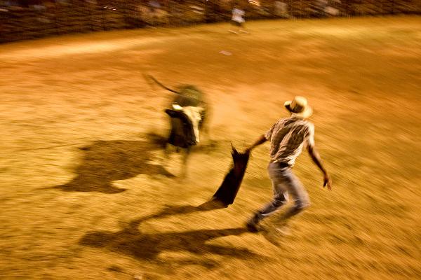 Un torero improvisado probando suertes con el toro. El capote es lo único que hay entre el hombre y la bestia.