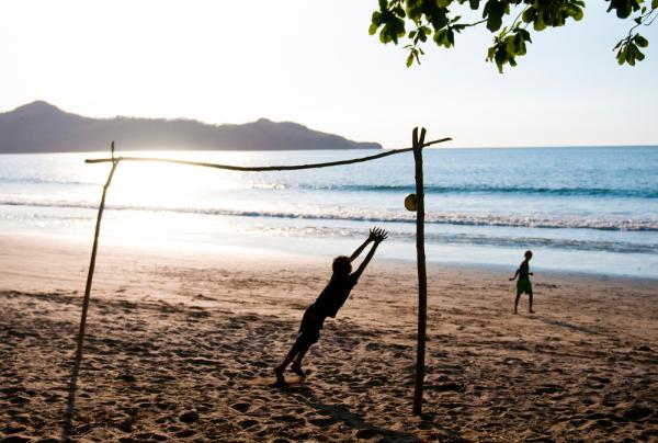 Dos niños jugando futbol de playa en una cancha improvisada.