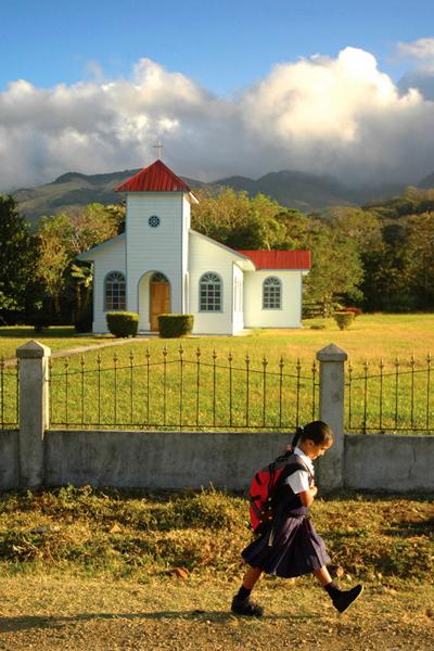 De esta escena nos conmovieron en igual medida dos cosas: la modestia y sencillez de la iglesia y la niña que, a paso de ganso, marcha hacia la escuela.