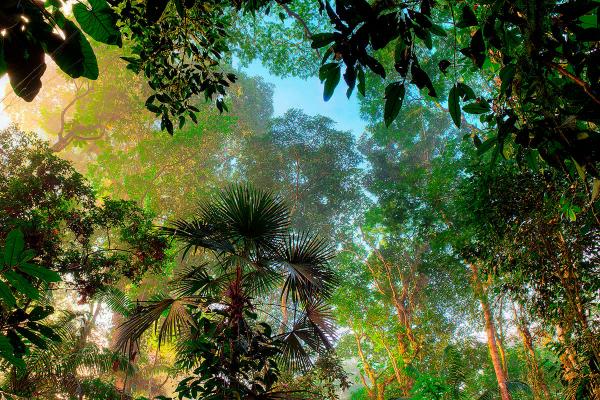El dosel en la Reserva Cinco Ceibas, captado en un ángulo contrapicado que le da altura a los árboles.