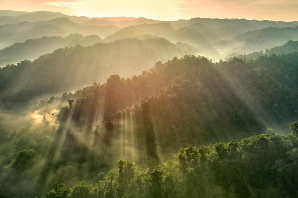 Fotografía de un macizo montañoso iluminado por el amanecer.