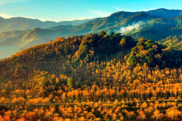 Bosque de porós cubriendo los cafetales del Valle de Orosi. Lamentablemente desaparecieron para siempre, pues los árboles fueron talados al eliminar el cafetal.