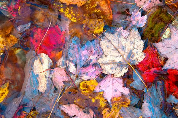 Estas hojas, caídas a causa de la llegada del otoño, en un pequeño estanque, nos dieron la oportunidad de captar su variedad cromática, parcialmente dominada por la palidez de ceniza de una mayoría de las hojas.