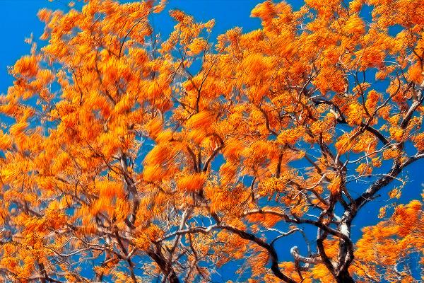Mediante exposición prolongada, se ven los efectos del viento sobre las ramas del sangrillo; árbol capaz de cambiar la tonalidad de sus flores de un año al otro.
