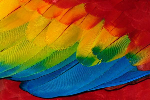 Detalle del plumaje de una lapa roja y especie bajo amenaza.