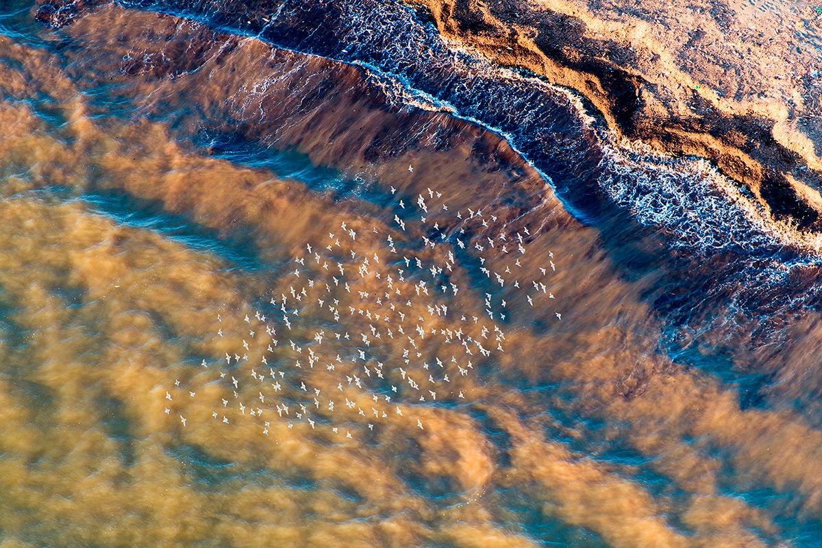 Una bandada de gaviotas mientras sobrevolaba cerca de la costa. Su número sugiere que descubrieron un cardumen.