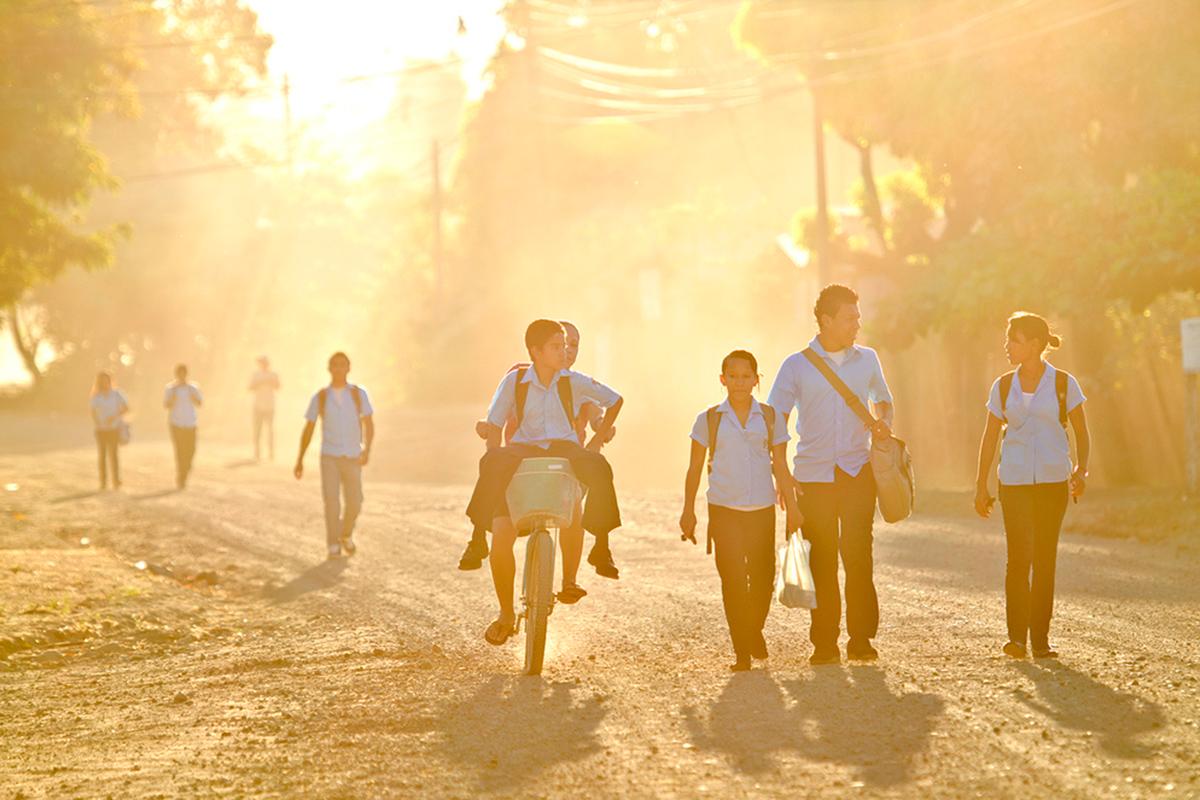 Un grupo de jóvenes se dirige por un camino polvoriento para asistir a clases. Como ellos, miles de estudiantes deben recorrer muchos kilómetros para labrarse un mejor futuro.