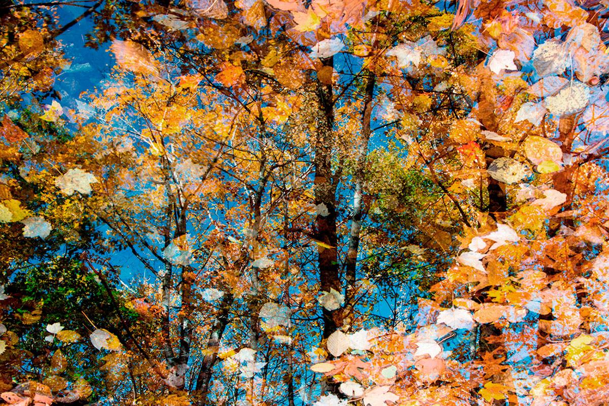 Otra imagen de hojas flotando en un estanque, en que el tenue reflejo de los troncos en el agua funciona como una especie de sobre-exposición espontánea.