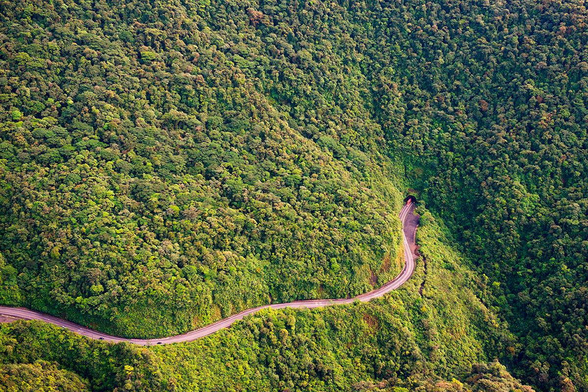Vista aérea que nos muestra cómo la Autopista Braulio Carrillo se extiende entre los cerros de la Cordillera Volcánica Central.