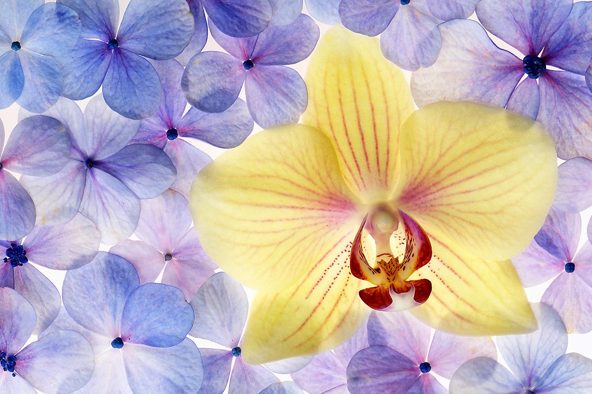 Orquídea y pétalos en una composición efectuada en estudio con una técnica a trasluz.