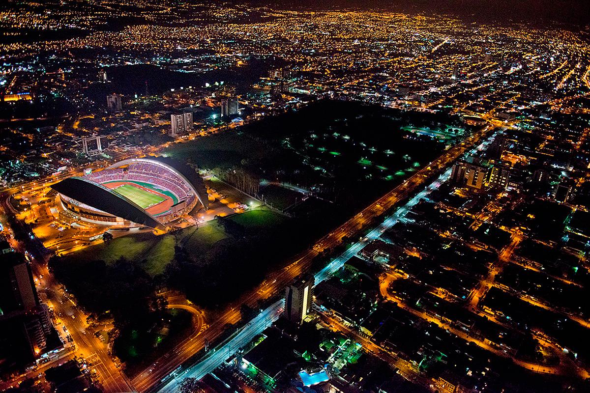 Fotografía nocturna de La Sabana que permite apreciar la porción del parque que ocupa el Estadio Nacional.