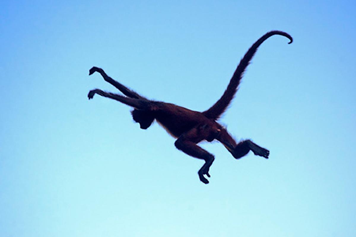 Mono araña captado mientras saltaba entre los árboles. Su cola prensil es tan hábil que equivale a una quinta extremidad.